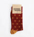 Calcetines de media caña en color burdeos con logo Hoodies to Heaven en mostaza.